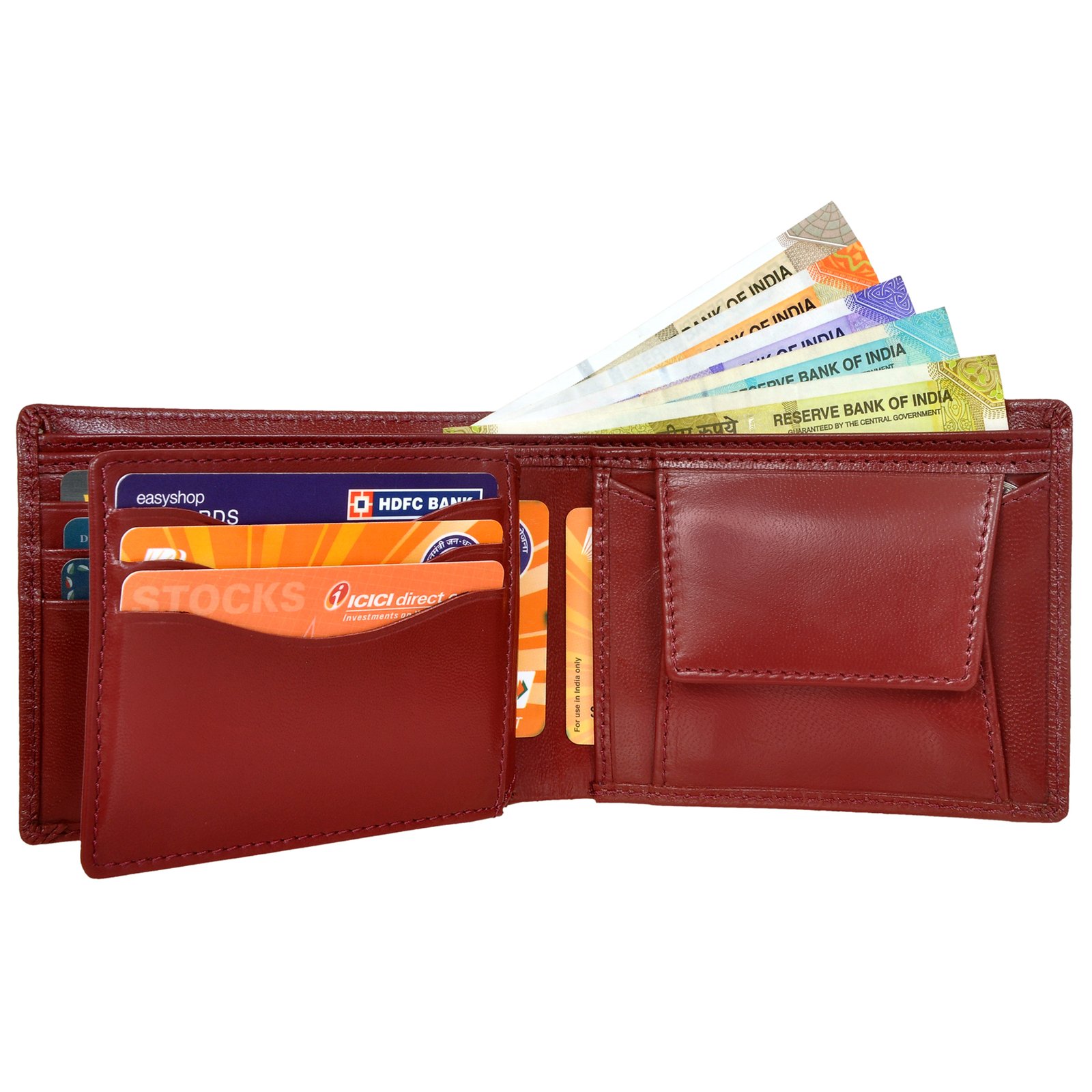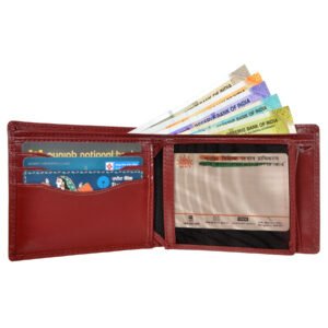 Introducing the smart cherry colour wallet, hand cut and sewn with meticulous detail, the corners are strengthened to avoid tearing and each wallet is lined with beautiful contrasting cloth lining which complements the leather perfectly. The RFID protection in the wallet secures your financial transactions too from any fraud. The wallet offers a much larger capacity for credit cards and notes than traditional wallets. Our classic billfold coin wallet features six credit card pockets, two full length pockets for notes, two hidden multipurpose pockets, License holder pocket and a handy coin compartment with snap fastener.
