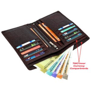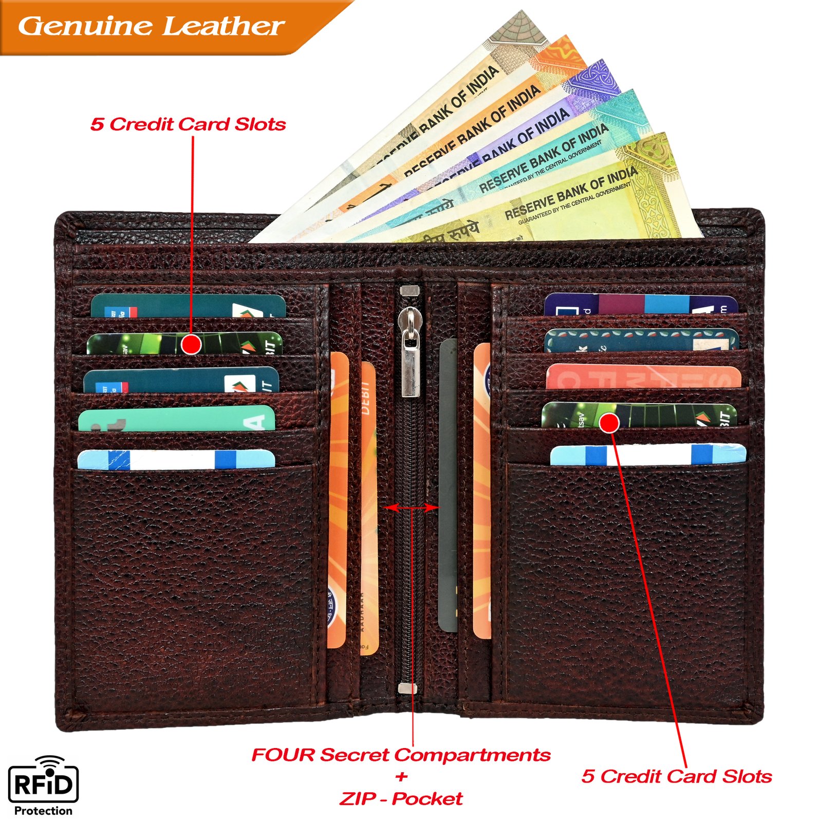 Men’s Wallet, Full Grain Leather, Note Case, 10 Card Slots with 1 Zip Pocket, Passport Pocket, 2 Currency and 4 Hidden Compartments, RFID Protected
