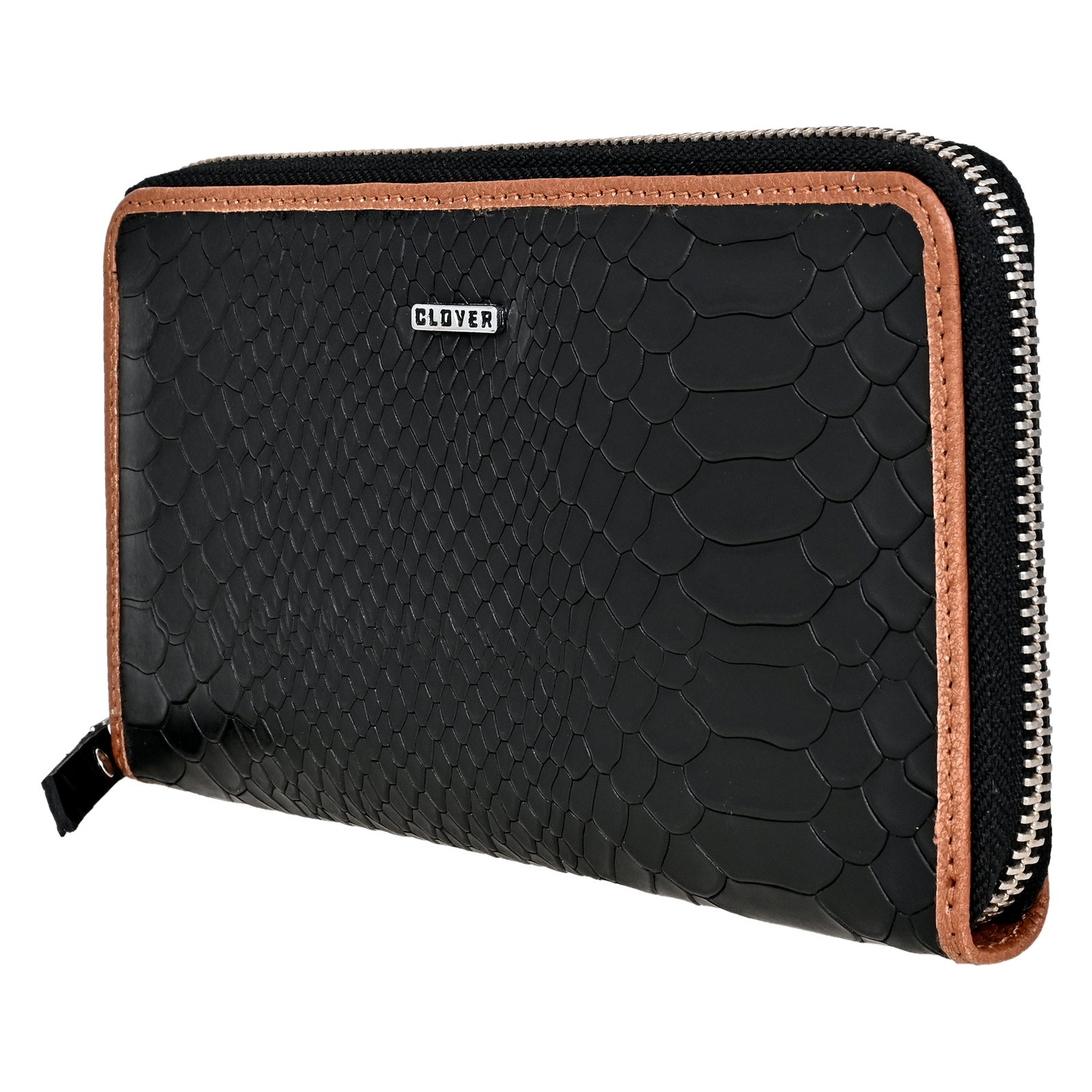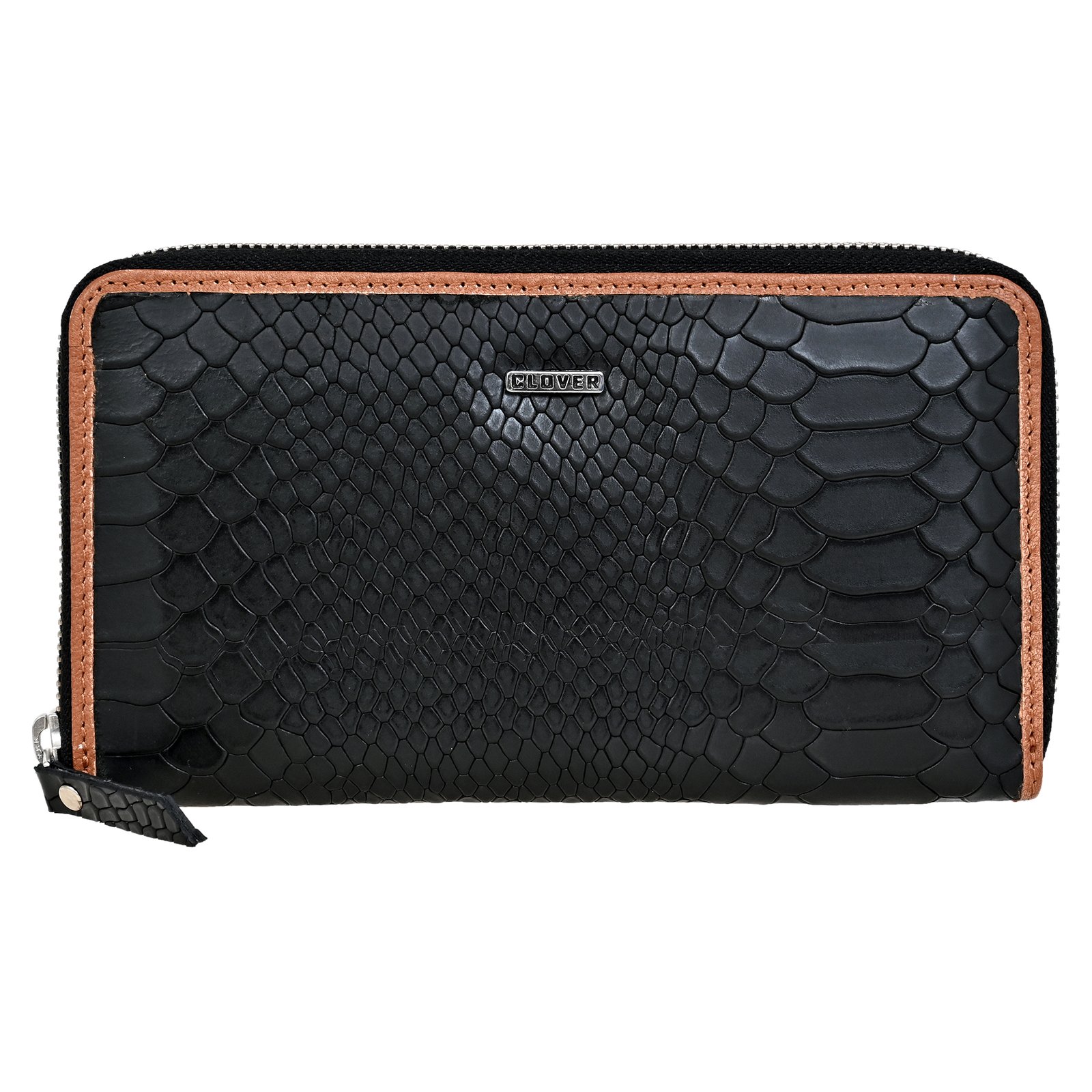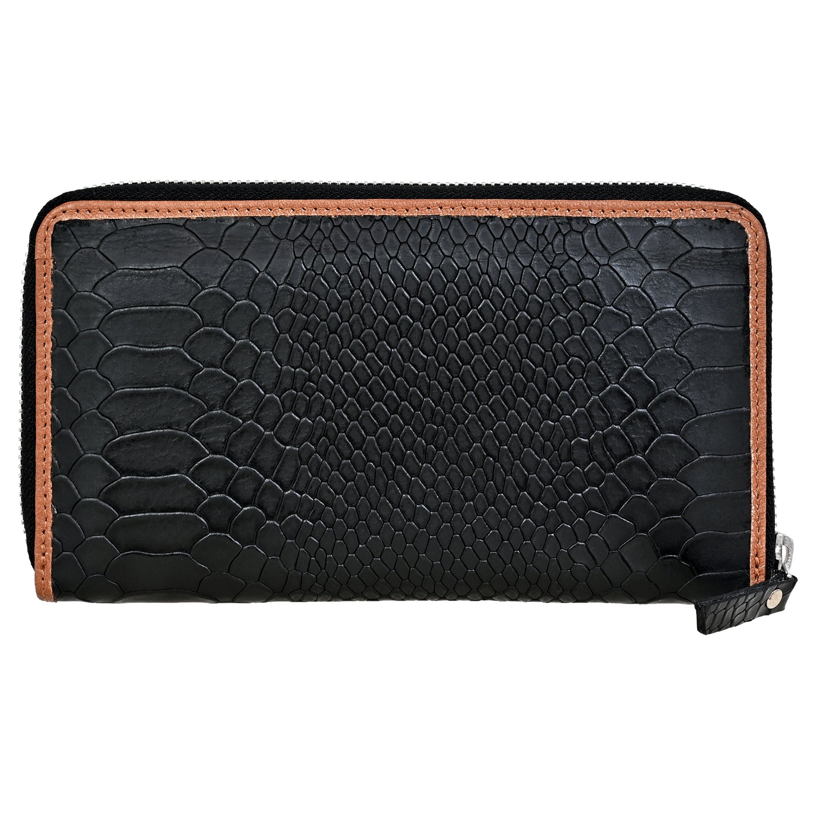 Fabrizia, Lizard Finish Black Ladies Clutch with Tan Piping, Top Grain Leather, Multiple Card Slots with Coin Pocket, RFID Protected | Clover