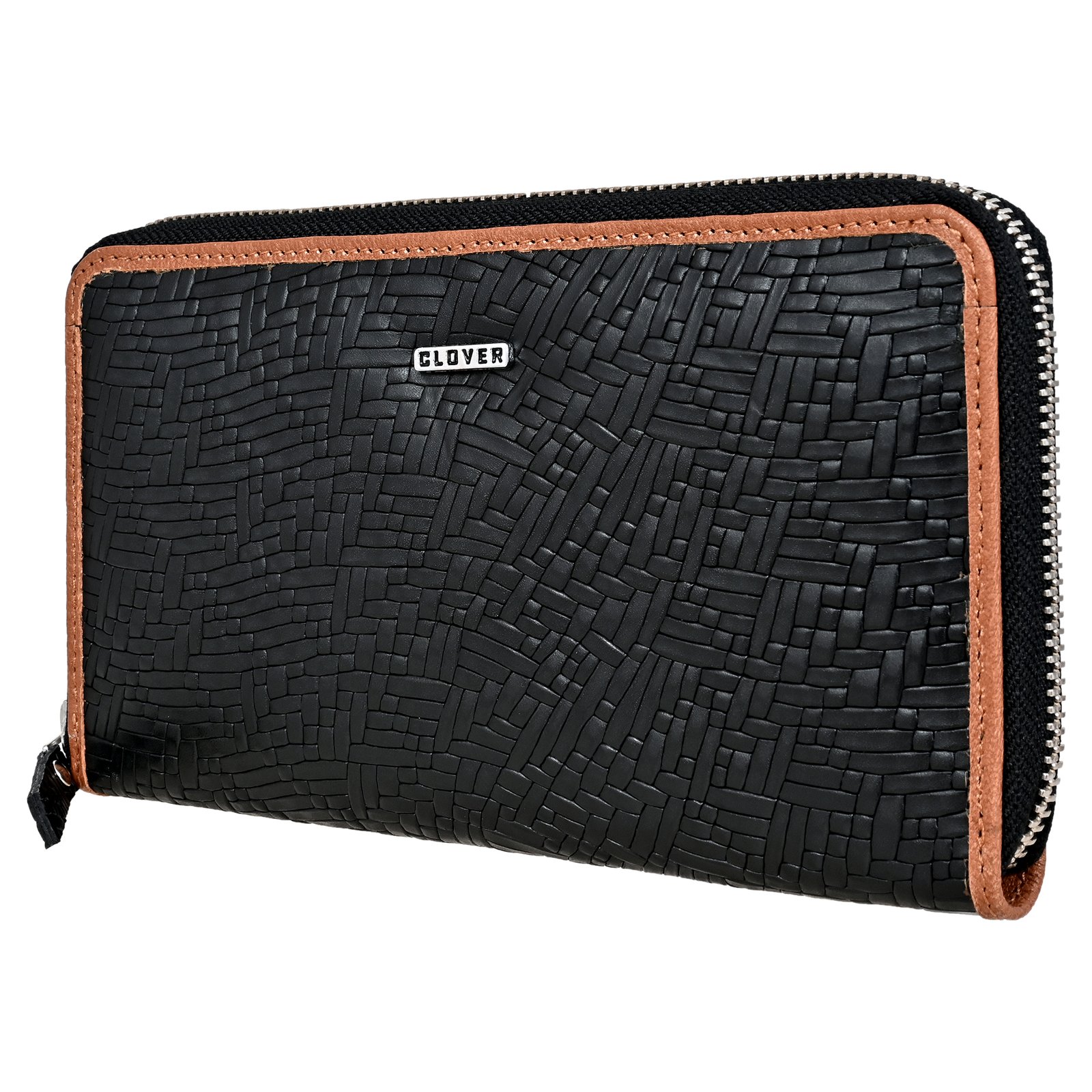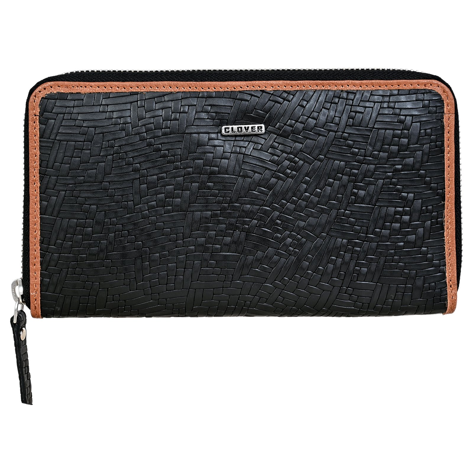 Fabrizia, Net Finish Black Ladies Clutch with Tan Piping, Top Grain Leather, Multiple Card Slots with Coin Pocket, RFID Protected | Clover