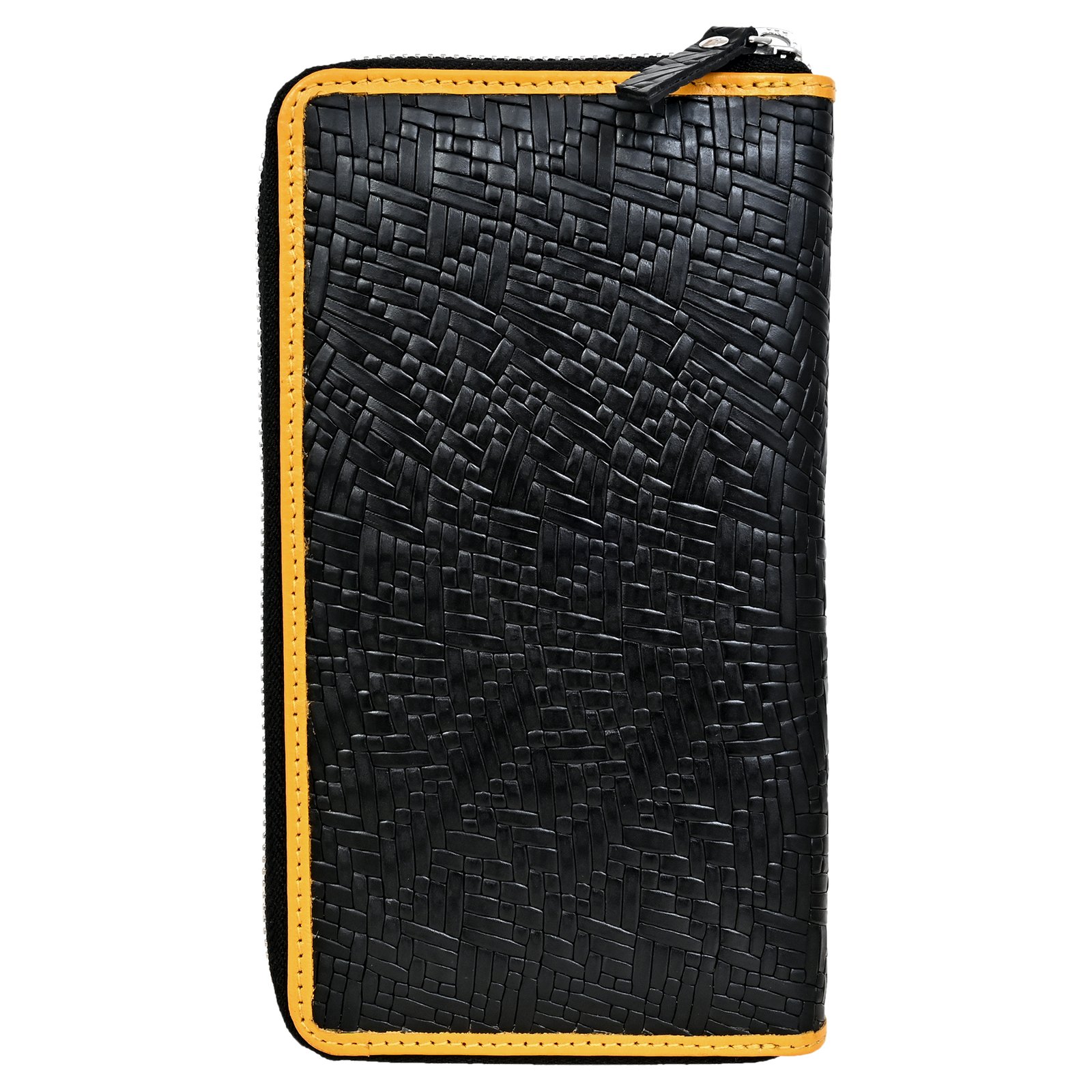 Fabrizia, Net Finish Black Ladies Clutch with Yellow Piping, Top Grain Leather, Multiple Card Slots with Coin Pocket, RFID Protected | Clover