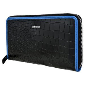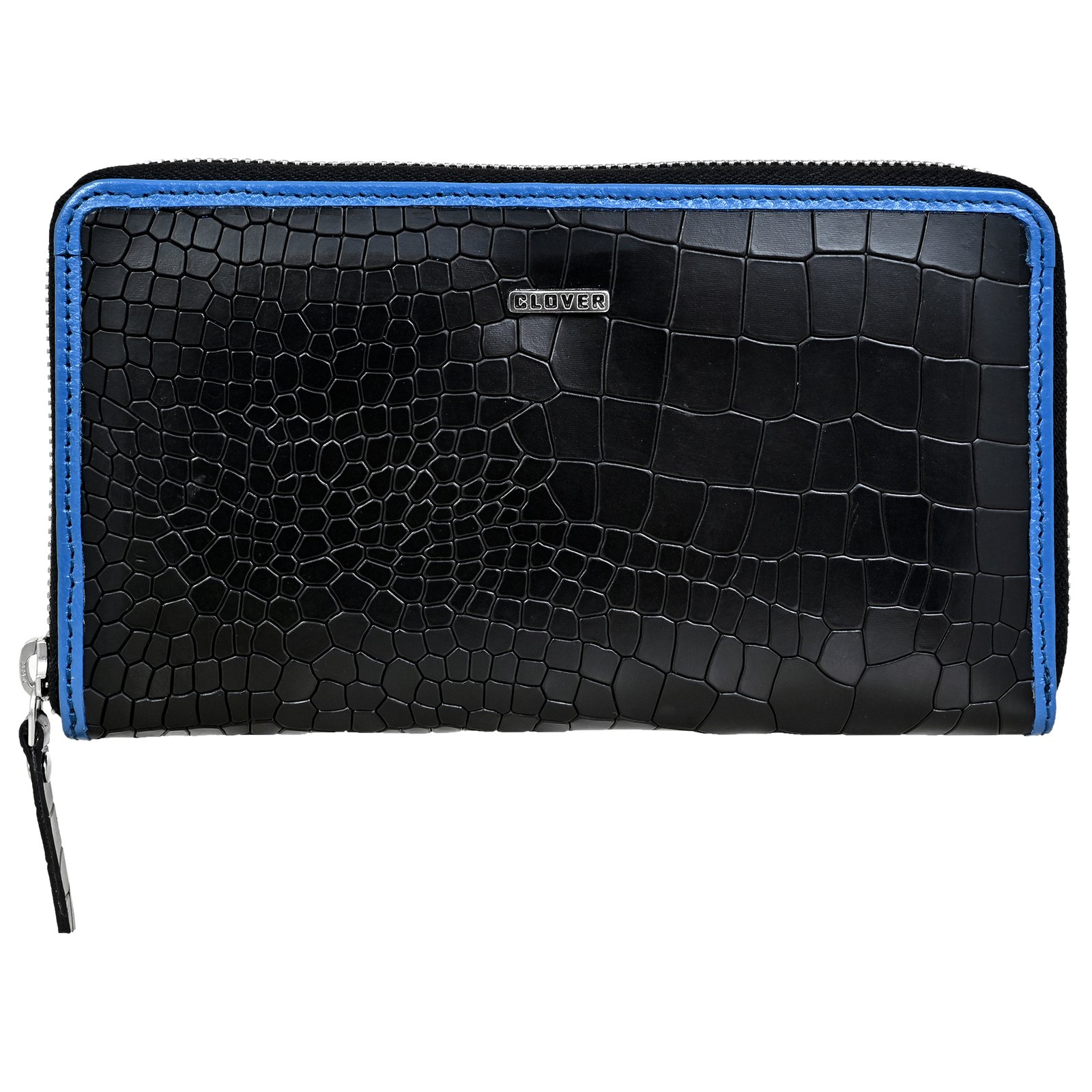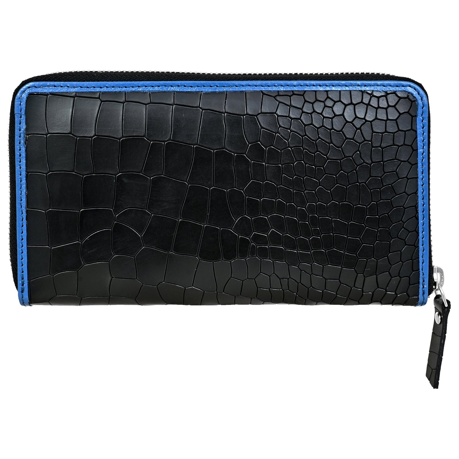 Fabrizia, Croco Finish Black Ladies Clutch with Blue Piping, Top Grain Leather, Multiple Card Slots with Coin Pocket, RFID Protected | Clover